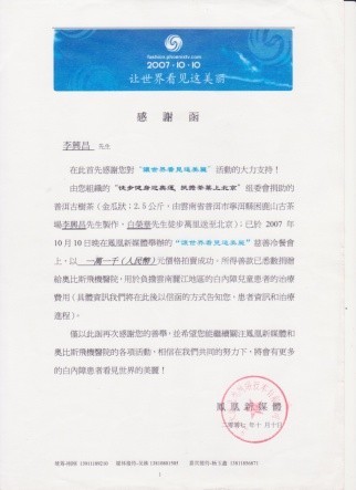 资助白荣华协议 捐助云南丽江儿童复明感谢函