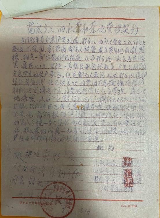 1987年匡志英女士80岁大寿时,为了保护古茶树、古茶园,发扬光大传统普洱茶•贡茶制作技艺。她作出了一个决定,化一生积蓄,与生产队买下了近百亩的古茶园经营权,交给子孙们进行管理,并嘱咐一定要管好古茶园,不得荒废,完成了她们夫妇一生的夙愿。